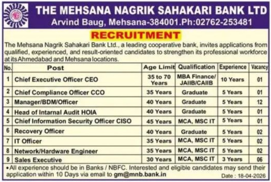 Mehsana Nagrik Sahakari Bank Recruitment 2026 for CEO, IT Officer & Other Posts